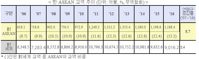 ㅇ 對ASEAN 교역 비중도 ‘07년 9.9%에서 ’16년 13.2%로 증가하여 ASEAN은 한국의 제2의 교역 지역임(제1교역국: 중국 2,114억불)