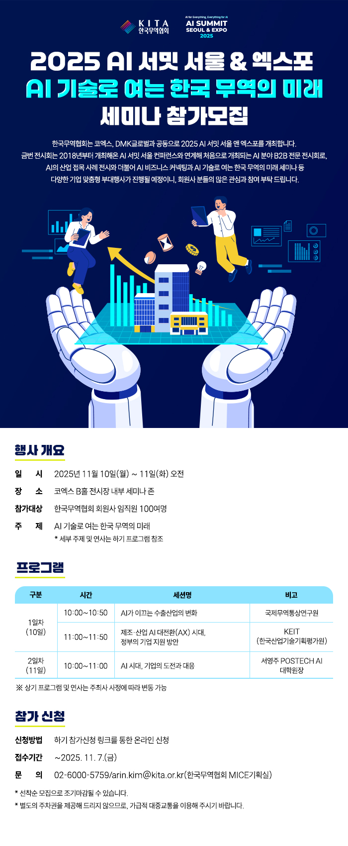 [AI 서밋 서울 & 엑스포] 'AI 기술로 여는 한국 무역의 미래' 세미나 참가모집(~11/7)