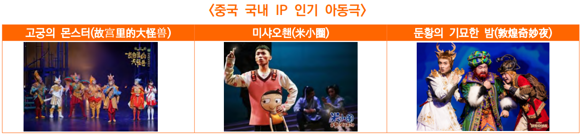 o 아동극 콘텐츠는 국내외 유명 아동용 IP(지식재산권)로 구성되었고, 국내 IP는 ‘고궁 시리즈’, ‘미샤오쵄(米小圈)’, ‘둔황의 기묘한 밤(敦煌奇妙夜)’ 등, 해외 IP는 브로드웨이 연극, 울트라맨, 겨울왕국 등이 인기