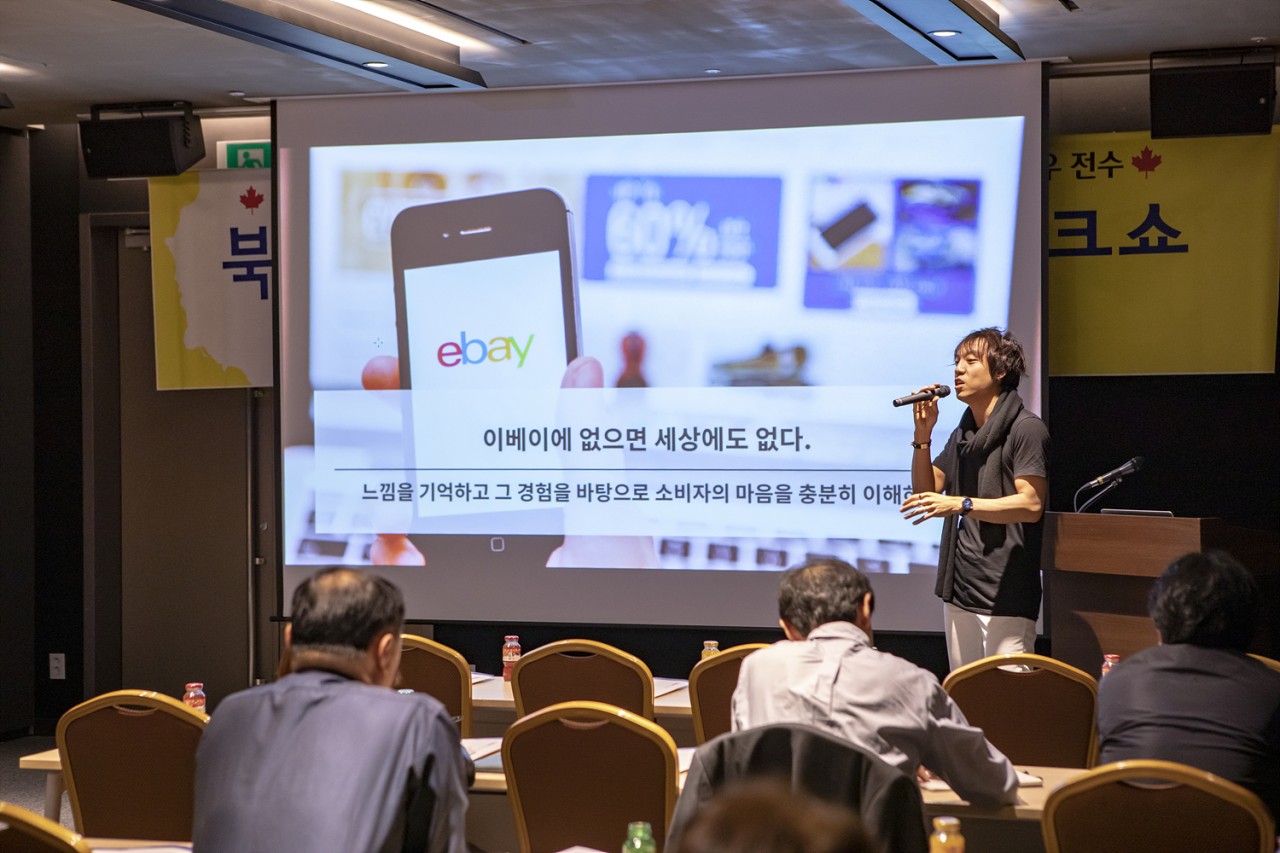 ALC21 대표가 4월 19일 COEX에서 한국무역신문이 개최한 ‘북미 진출 및 해외 글로벌 마케팅 토크쇼’에서 강연하고 있다. 그는 확실한 브랜드를 구축하지 않으면 북미시장에서 성공하기 힘들다고 말했다. <사진=오건호 기자>