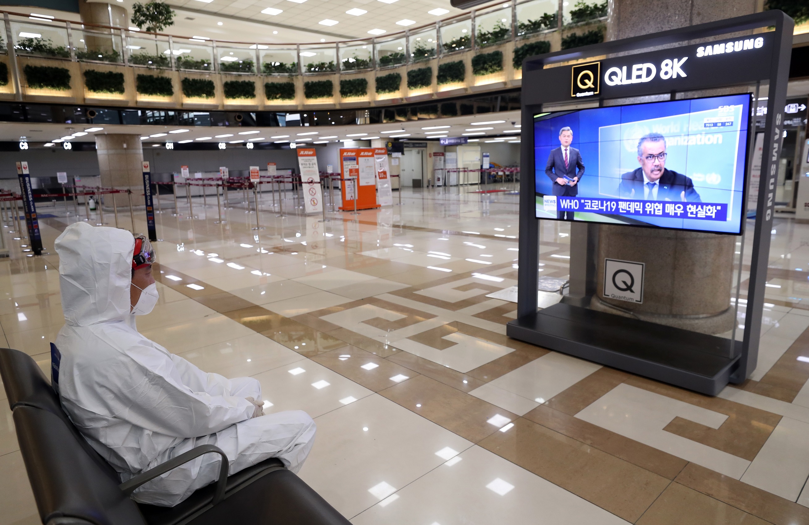 ▲한 방역업체 관계자가 지난 3월 10일 오후 서울 강서구 김포국제공항에서 신종 코로나바이러스 감염증(코로나19) 관련 뉴스를 시청하고 있다. 이날 한국과 일본이 양국 국민에 대한 90일 무비자 입국을 중단한지 이틀째를 맞아 평소에는 도쿄 하네다 공항행 여객으로 붐볐던 카운터는 한산하기 그지없는 모습이다. (서울=뉴시스)