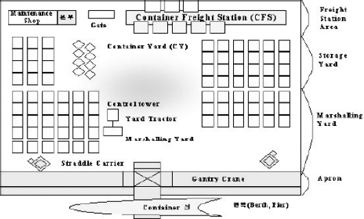 해상과 육상의 접점인 항만에 위치하는 컨테이너 터미널은 컨테이너 화물의 본선하역, 보관, 트럭, 철도에의 컨테이너 인수도, 컨테이너의 장치, 공컨테이너의 집화, 컨테이너의 수리 및 청소 등의 제반기능을 수행하는 장소이다.